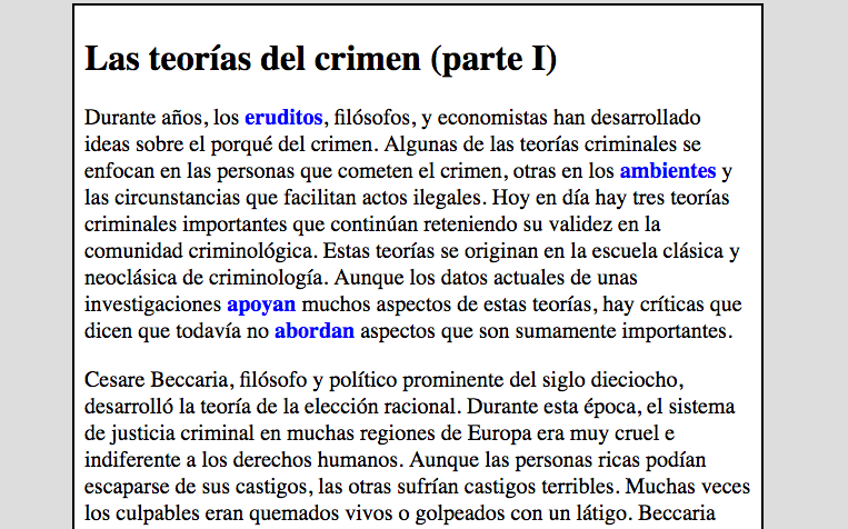 There are a few versions of the activity-one with highlighted words, one with text glosses, and one with audio glosses. At the end, users are prompted to enter a unique code that is only known by the student and the researcher, so that the researcher can later analyze the data.